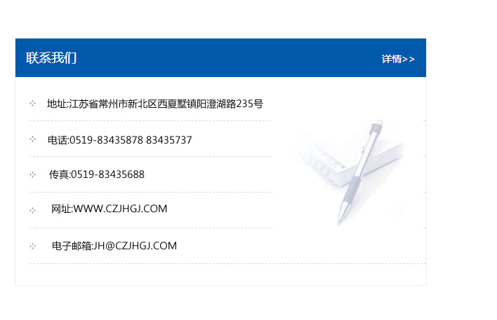 地址:常州市新北區友邦商務大廈1幢16、17層  電話:0519-85101652  傳真:0519-85112595  郵編:213022  網址:www_cz-jiayue_cn.izhongxia.com  郵箱:xiajifengaa@163.com